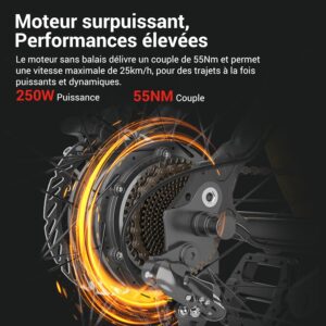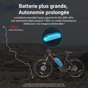 Eleglide Vélo Électrique est livré avec un puissant moteur sans balais qui peut fournir un couple de 𝟓𝟓 𝐍𝐦. Entraîné par un moteur puissant, le vélo peut accélérer jusqu’à 25 km/h. Avec une batterie lithium-ion remplaçable de 15.6 𝐀𝐡, il peut parcourir jusqu’à 130 𝐤𝐦 (80.8 mi) en mode d’assistance, ce qui est parfait pour votre long trajet.