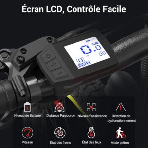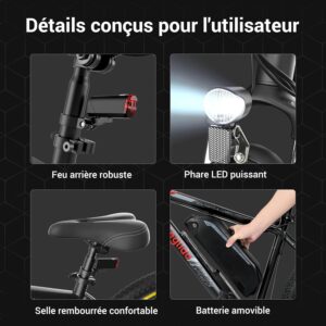 | Composants inclus | 1 x réflecteur arrière ; 4 x réflecteur à rayons, 1 x écran LCD ; 2 x clé; 1 x kit d'outils, 1 x vélo électrique ; 1 x manuel d'utilisation, 1 chargeur ; 2 pédales, 1 x phare ; 1 x selle; 1 x kit d'accélérateur |